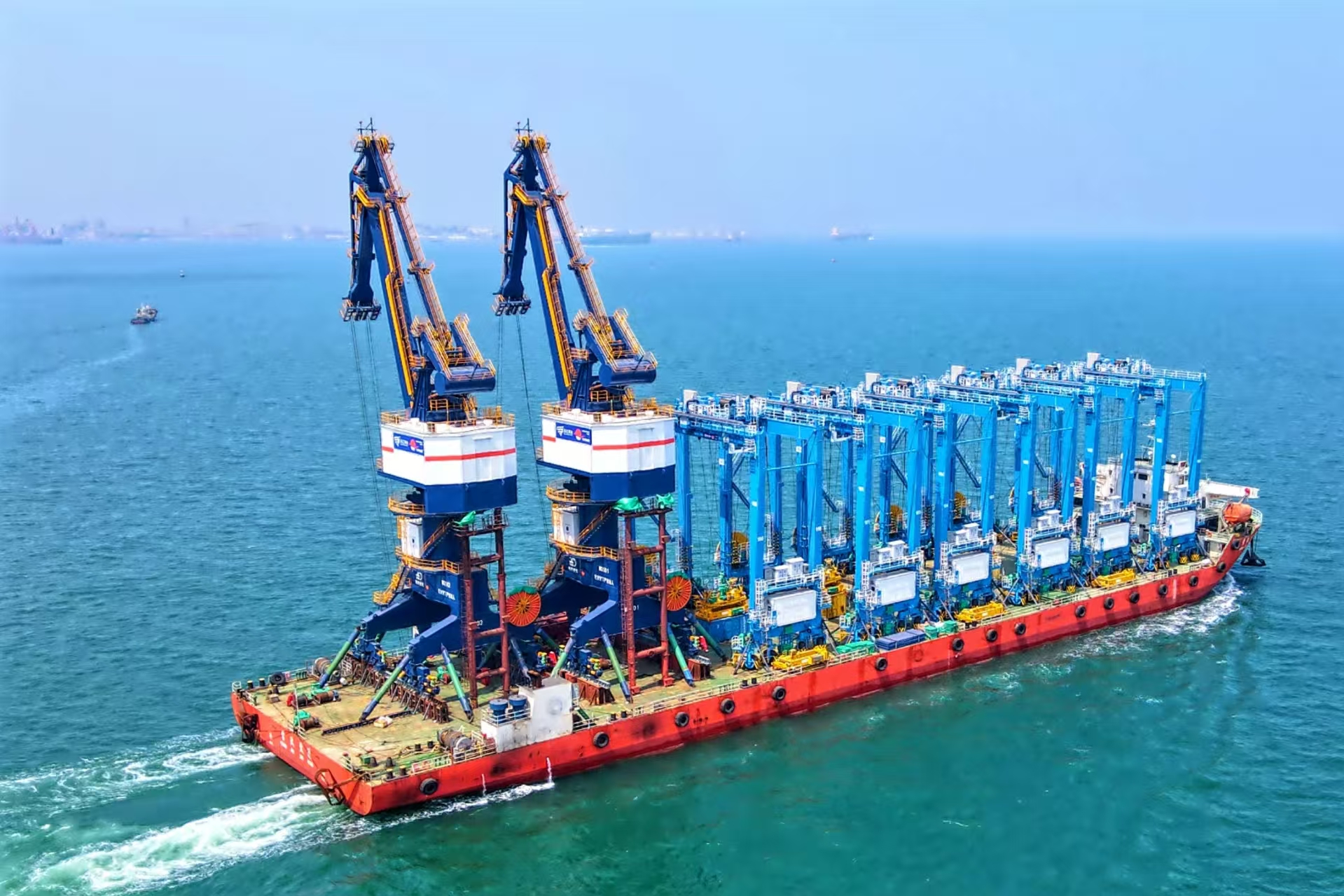 該批門機(jī)配有吊鉤、抓斗、集裝箱吊具,用于件雜貨作業(yè)以及集裝箱、抓斗作業(yè),可滿足5萬噸級貨船的裝卸需求,將與前期武漢船機(jī)海西重機(jī)為其打造的批量岸橋協(xié)同作業(yè)。